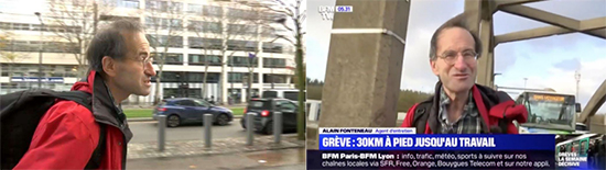 經(jīng)過(guò)諸多媒體的報(bào)道后,就有記者找到阿蘭·馮特諾,經(jīng)采訪得知他家住伊夫林省拉韋里耶爾鎮(zhèn)。在公交系統(tǒng)罷工已經(jīng)持續(xù)多日的情況下,與很多大巴黎地區(qū)的居民一樣,他下班返家面臨極大困難。上班時(shí),他通常每天早上6點(diǎn)半開(kāi)始以分時(shí)段的方式工作,有時(shí)下班時(shí)間是晚上8點(diǎn)。罷工開(kāi)始后,他與公司協(xié)商后將上班時(shí)間提前至早上6時(shí),這樣他每天就可以從家中乘坐一趟夜班車(chē)進(jìn)城。至于下班后通勤就變得異常棘手了。而他只有兩種選擇,第一種就是步行至巴黎蒙巴納斯火車(chē)站乘坐遠(yuǎn)郊鐵路N線或U線。但罷工期間,這些線路只在下午4點(diǎn)半后才開(kāi)始恢復(fù)運(yùn)行;而第二種選擇就是全程步行回家,距離是30公里。徒步需然后先后穿行圣西爾、圣康丹、特拉普等市鎮(zhèn),然后才回到拉韋里耶爾鎮(zhèn)的家中。